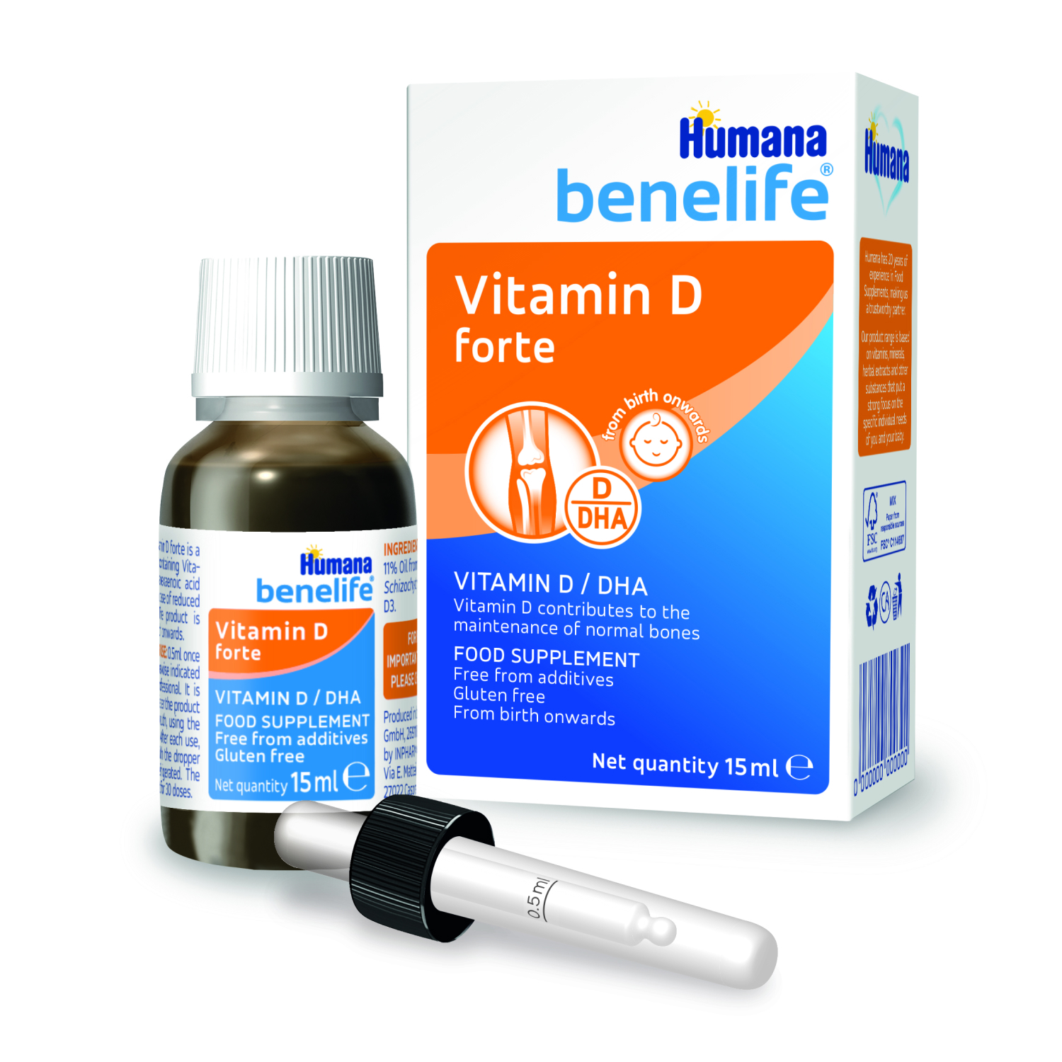Humana Benelife D3 400 IU+ DHA - это пищевая добавка, которая рекомендуется в качестве источника витамина D3 для детей с рождения, детей старшего возраста и взрослых.