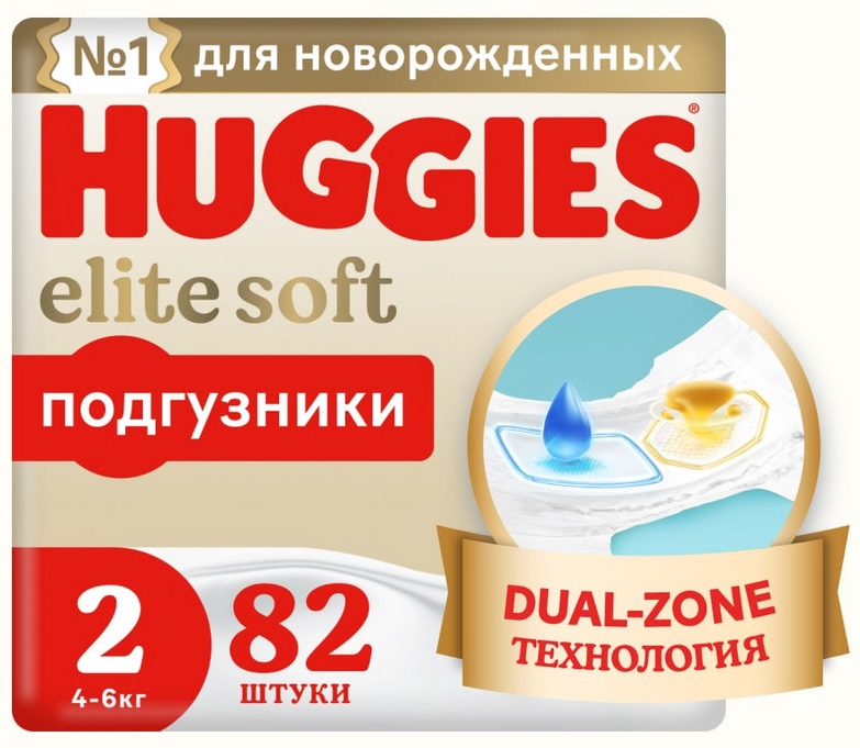 Подгузники Huggies Elite Soft для новорожденных 4-6кг, 2 размер, 82шт