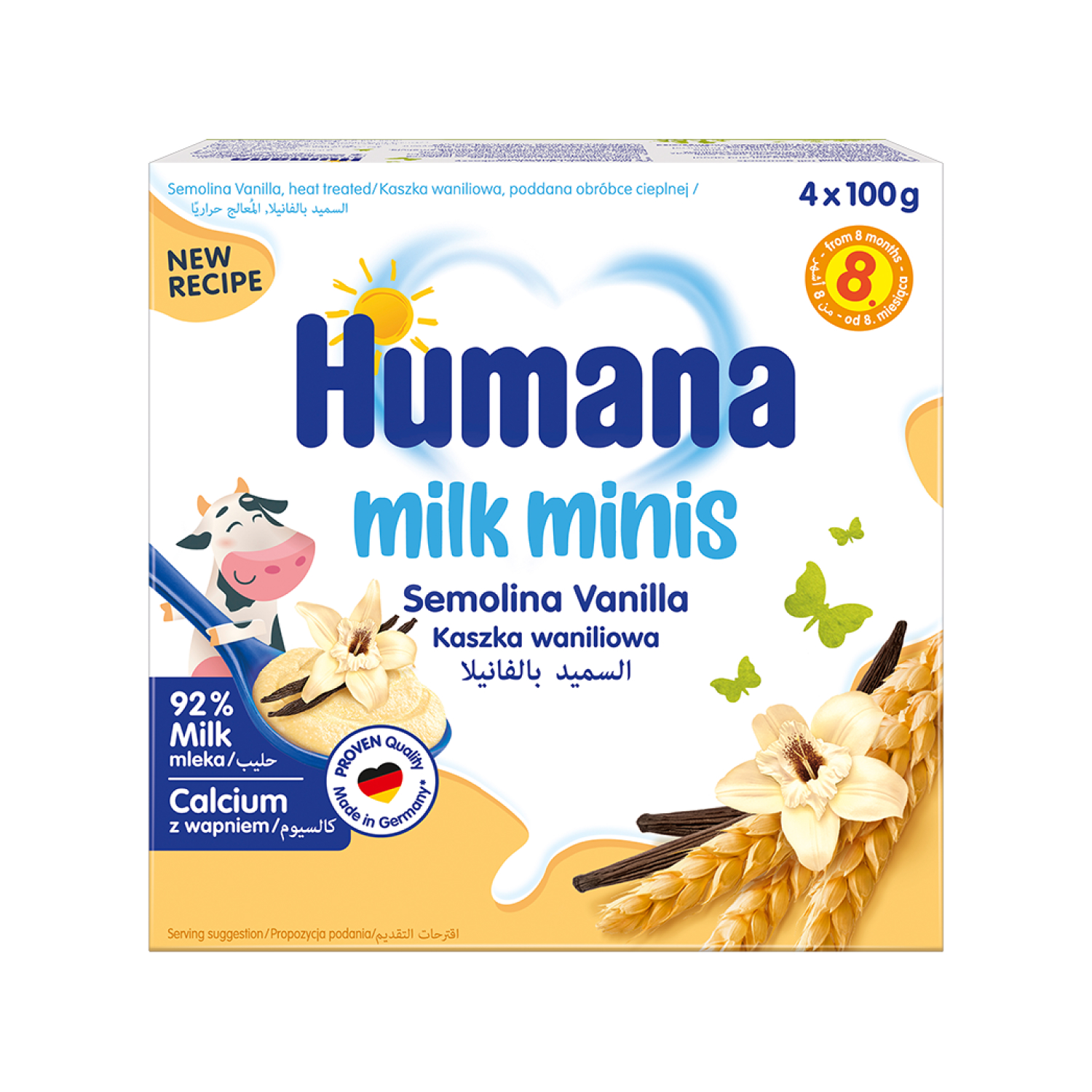 Каша манная с ванилью Humana обогащен витамином В2, кальцием, магнием. Полезен для детей любого возраста (старше 8 месяцев) и взрослых. В производстве используется только свежее молоко.