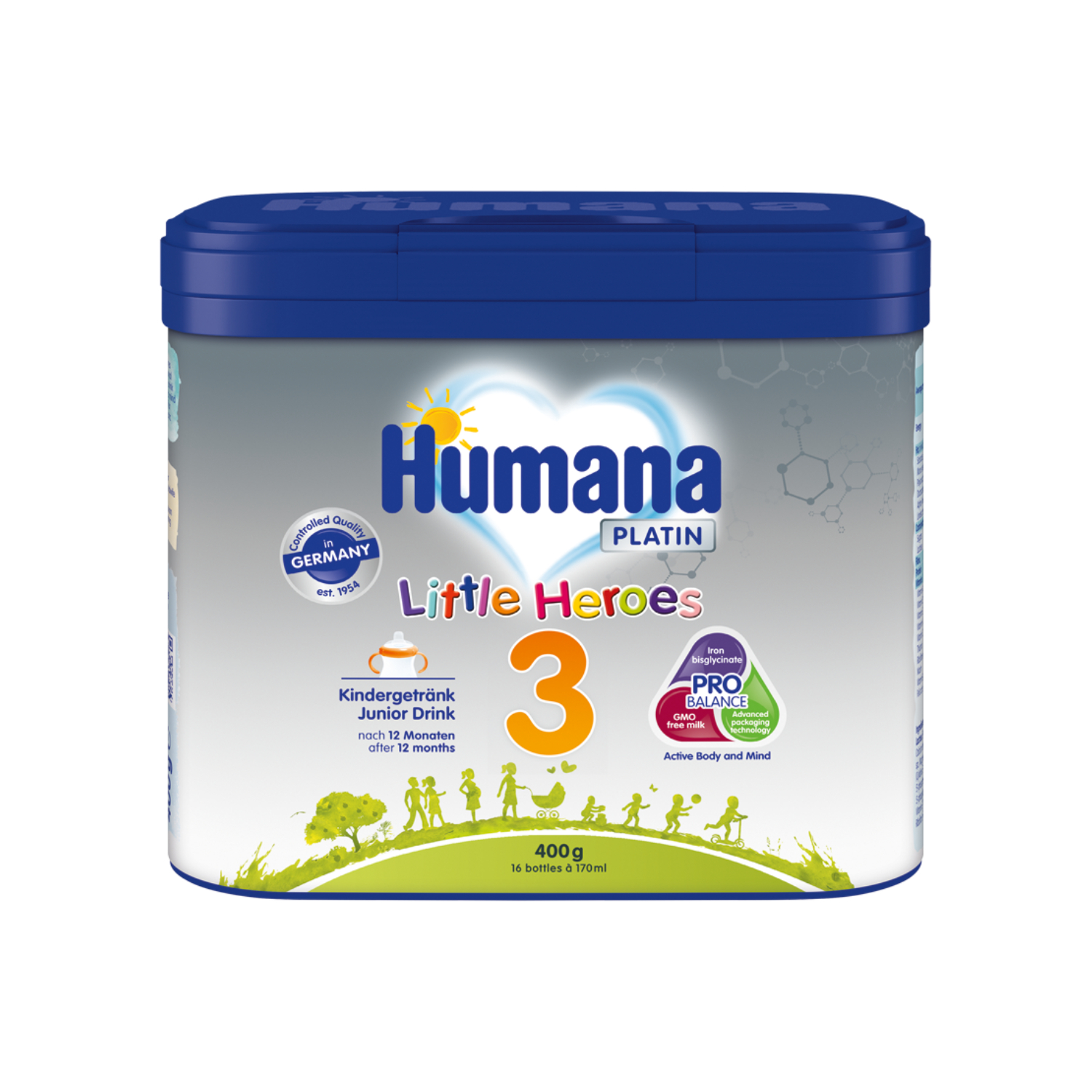 Молочная смесь Humana Platin — это специально разработанная молочная смесь, которая по составу и полезности максимально приближена к грудному молоку. Наша смесь Humana 3 Little Heroes обеспечивает вашего малыша всеми необходимыми питательными веществами для своевременного когнитивного развития и развития моторики.