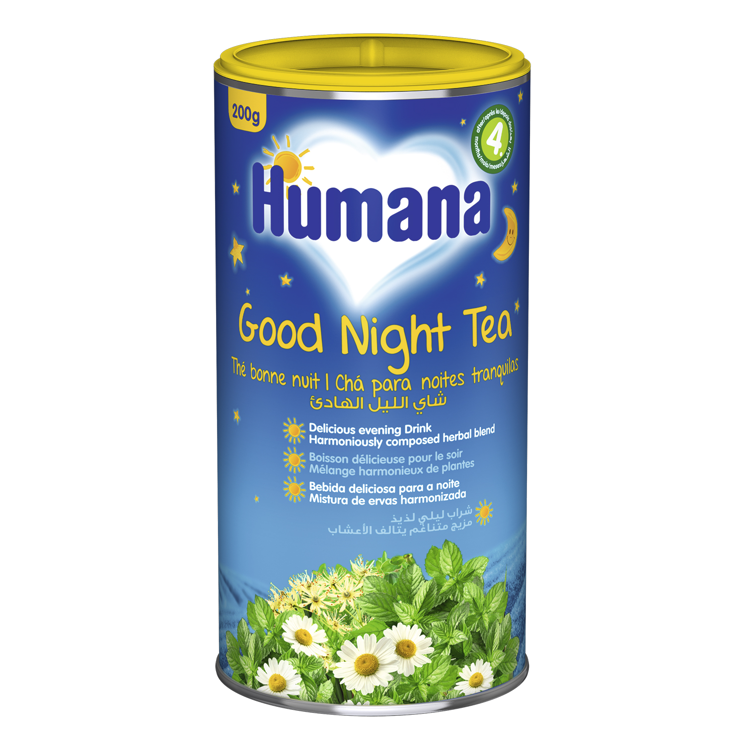 Мягкий чай Humana "Спокойной ночи" с тщательно отобранными травами, такими как мелиса, ромашка и липа, хорошо известными своим успокаивающим эффектом.
